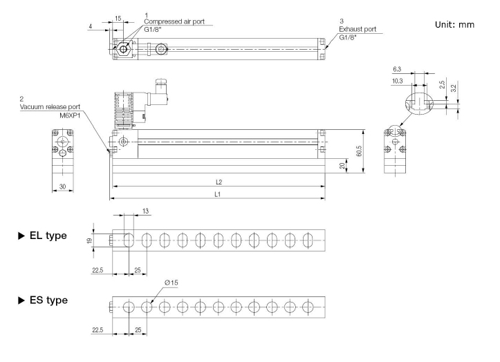 | G30X600-L1-ES | Vacuum gripper, Mini gripper, VC253, Foam pad, 30×600 mm, Round suction hole |